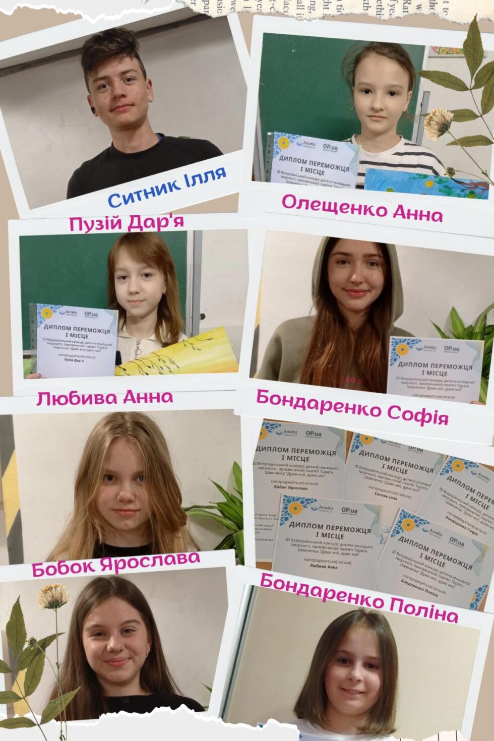 Учні відділення образотворчого мистецтва Школи мистецтв Кролевецької міської ради стали переможцями та отримали І місця у III Всеукраїнському конкурсі дитячо-юнацької творчості «Думи, мої думи»: Олещенко Анна, Ситник Ілля, Бондаренко Софія, Бондаренко Поліна, Любива Анна, Бобок Ярослава, Пузій Дар’я.